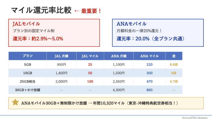 そして注目してほしいのがANAモバイルの30GBプランに無制限かけ放題をつけた場合。月額4,300円で毎月860マイル、年間で10,320マイルです。東京─沖縄の特典航空券に手が届くレベル。スマホ代だけで貯まるんですよ。JALモバイルにはそもそもこの組み合わせに相当するプランがありません。