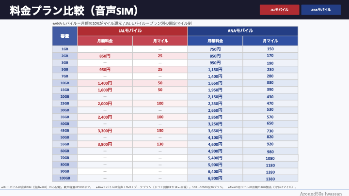小容量帯: JALモバイルは2GBで月額850円。ANAモバイルにも2GBプランがあって同じく850円。ただANAには1GBプランもあって750円から入れます。最安値で始めたいならANAの1GB・750円が最も安いです。