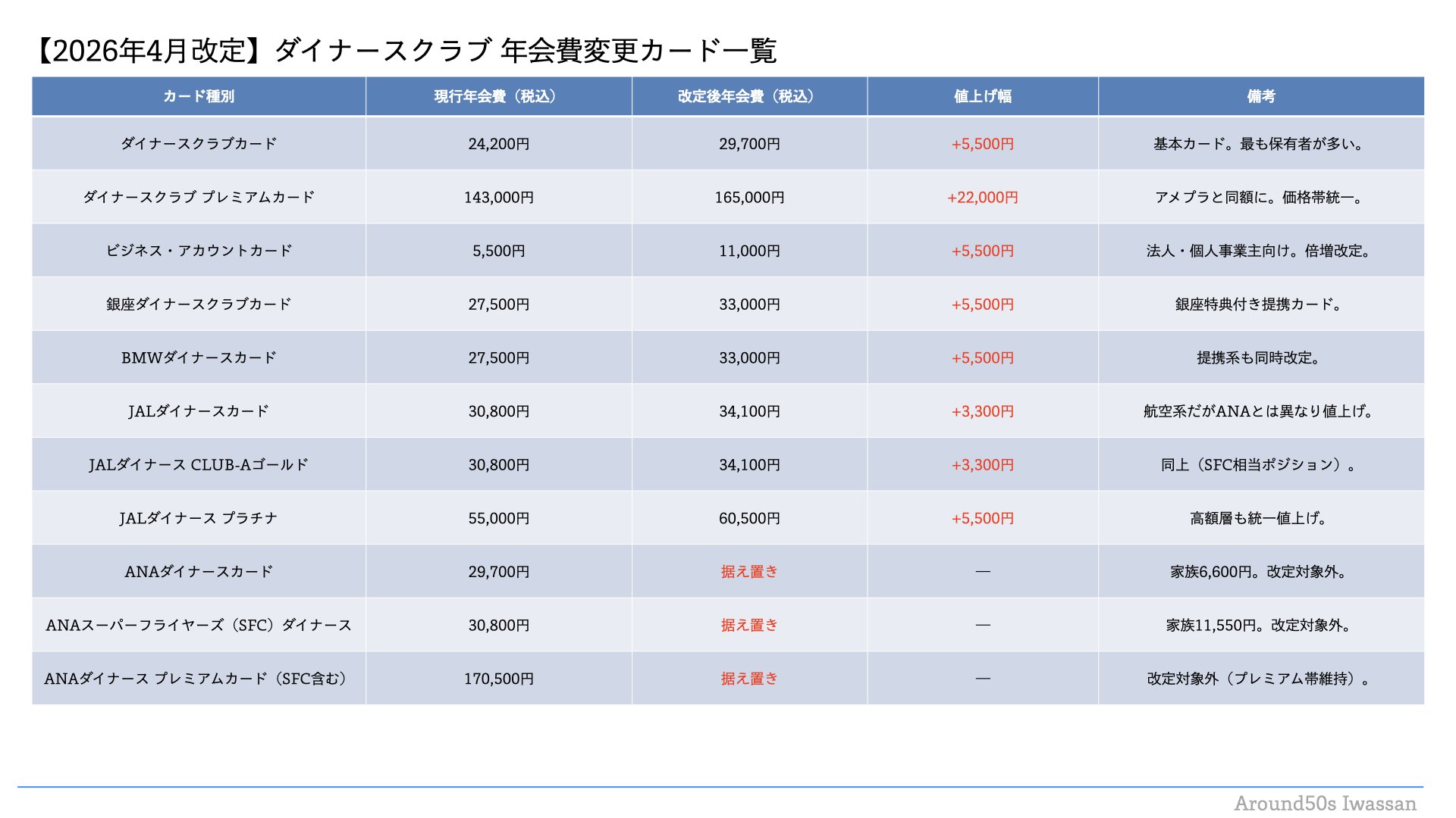 2026年4月以降、ダイナースクラブカードの年会費改定が発表されました。