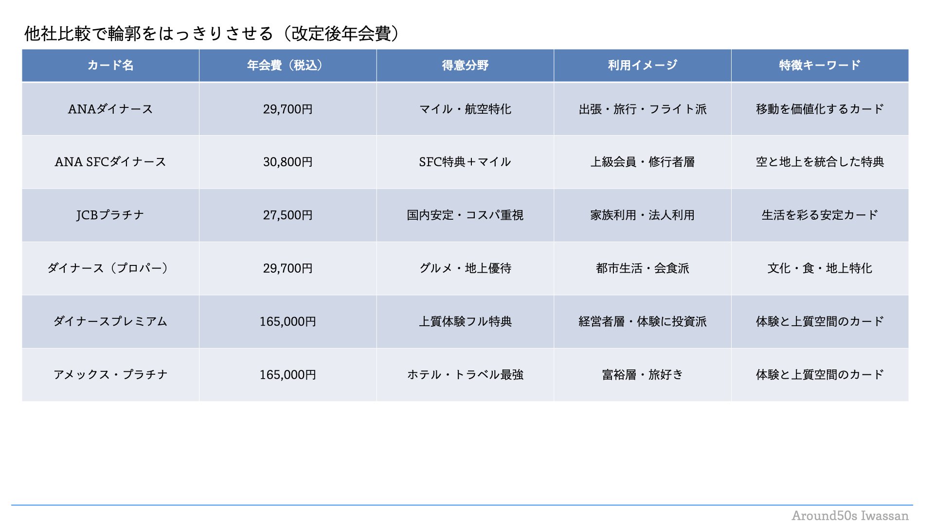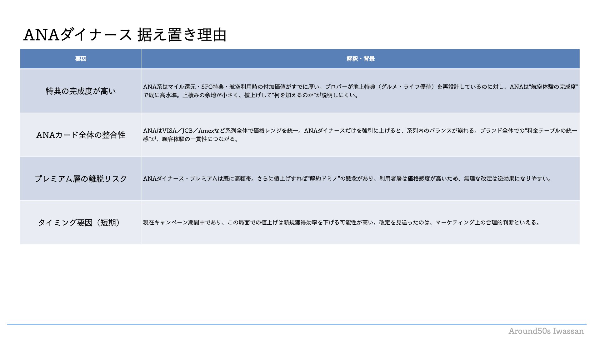 - VISA、JCB、Amexなど各ブランドで価格帯が整っているため、ANAダイナースだけ値上げするとバランスが崩れる。