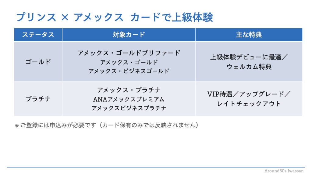 自動的にプリンスホテル上級会員(ゴールド/プラチナ)になれる特典があります。