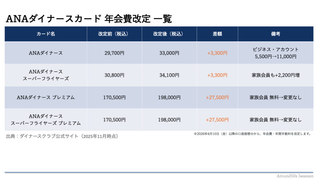 2025年11月、ダイナースクラブ公式サイトでANAダイナースカードおよびANAスーパーフライヤーズカードの年会費改定が正式に発表されました。